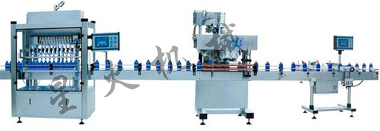 組成部分:理瓶機(jī)+送瓶機(jī)+全自動(dòng)直列式灌裝機(jī)+旋蓋機(jī)+噴碼機(jī)+貼標(biāo)機(jī)+收縮機(jī)+自動(dòng)封箱打包機(jī)